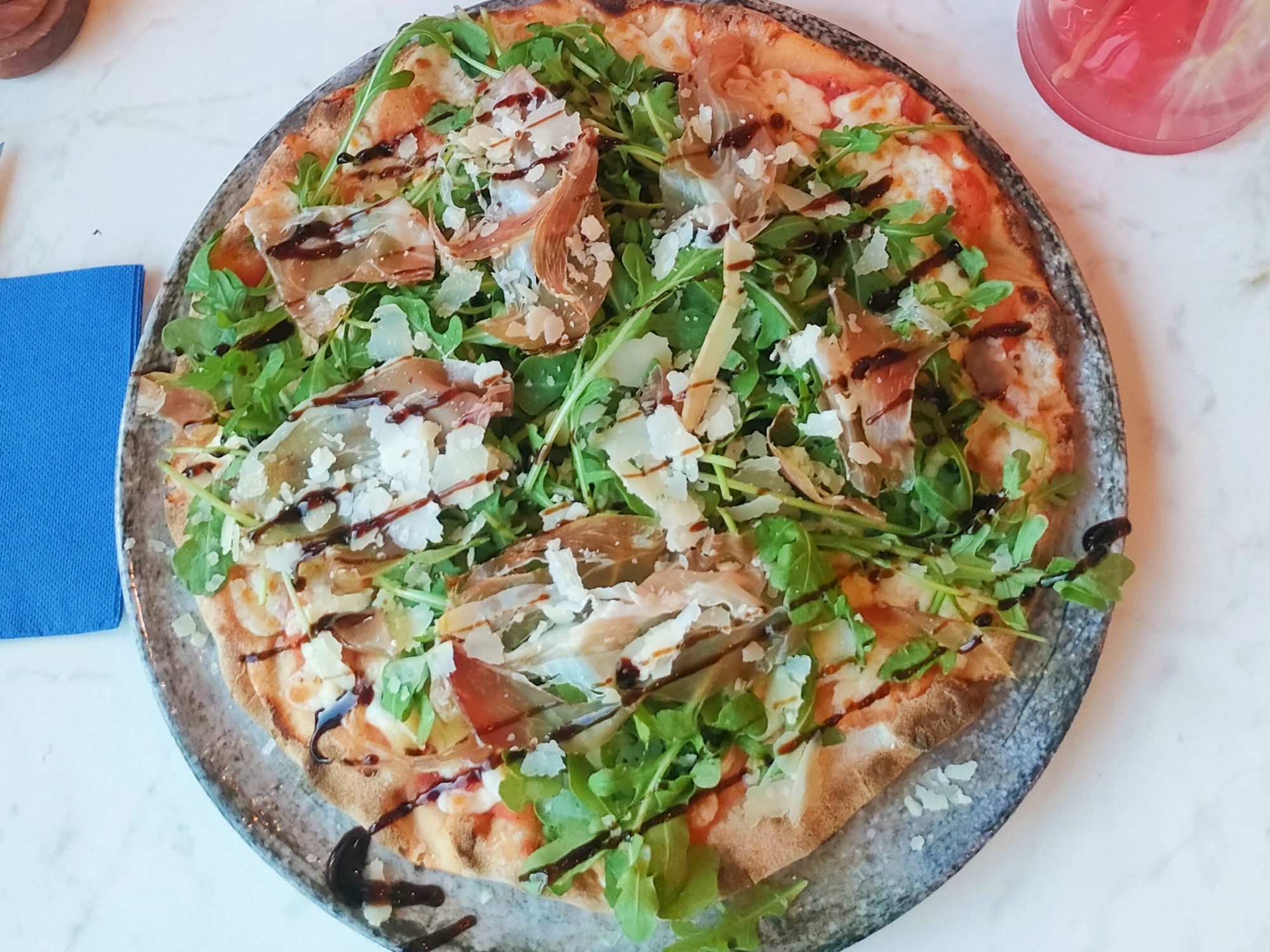 • De mon côté, j’ai opté pour une Pinsa au jambon cru, roquette et crème balsamique. Un vrai bijou culinaire. La pâte, aérienne et croustillante à la fois, mettait en valeur la fraîcheur des ingrédients. Chaque bouchée était un bonheur : léger, goûteux, sans lourdeur. Une dinguerie absolue.