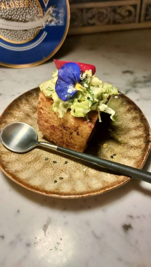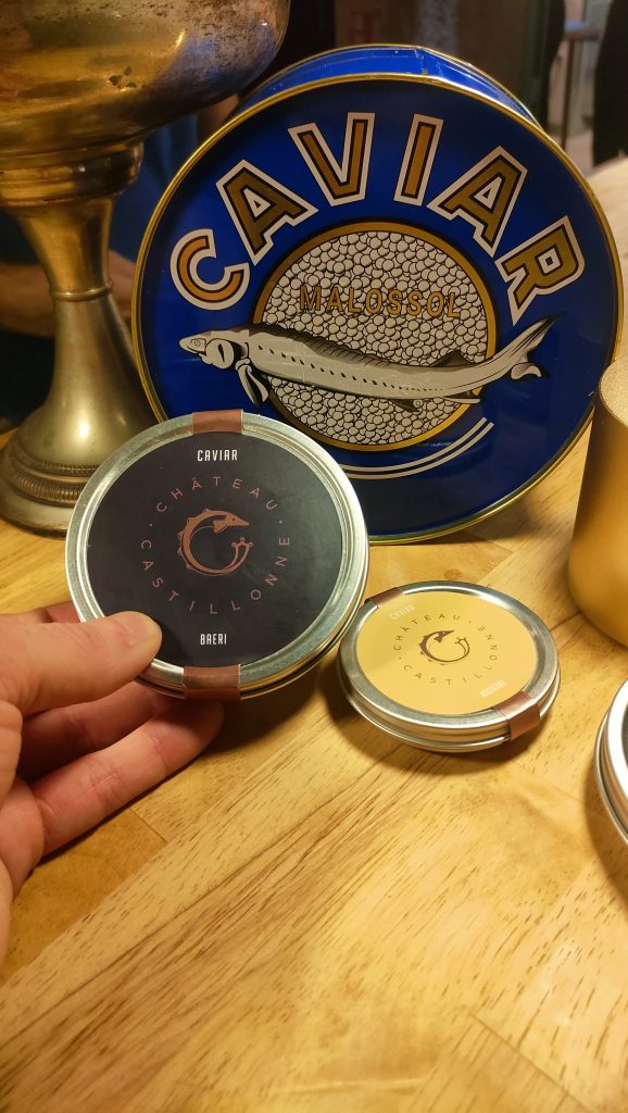 Et puis… le caviar. Ce caviar n’est pas un caviar ordinaire : il est produit par la pisciculture Château Castillonne, à Saint-Guilhem-le-Désert — un caviar « éthique », issu d’esturgeons dont les œufs sont récoltés par césarienne, sans tuer les poissons.